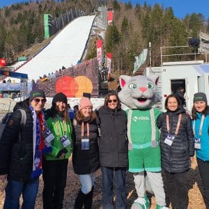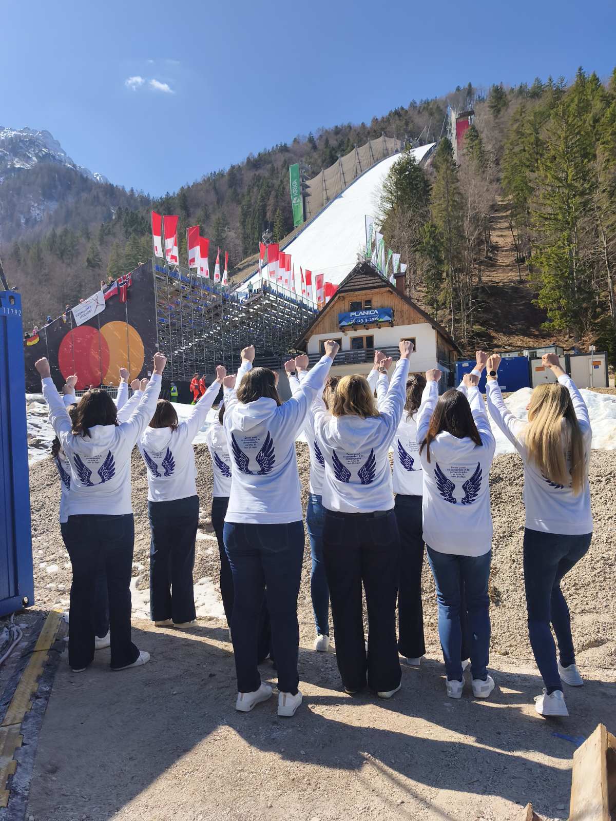 Nastop je spremljala velika množica obiskovalcev Planice, ki so z glasnim navijanjem podprli dogajanje ter ustvarili izjemno vzdušje v čast ženskih skakalk. Med njimi so bili tudi naši najbolj zvesti navijači in člani zbora, ki so s svojo energijo še dodatno obogatili dogodek. Koreografijo je pripravil priznani koreograf, plesalec in režiser Miha Krušič, in sicer na pesem Na krilih ljubezni, ki jo je skupina Elevators izdala leta 2001 na albumu Elevator Music.