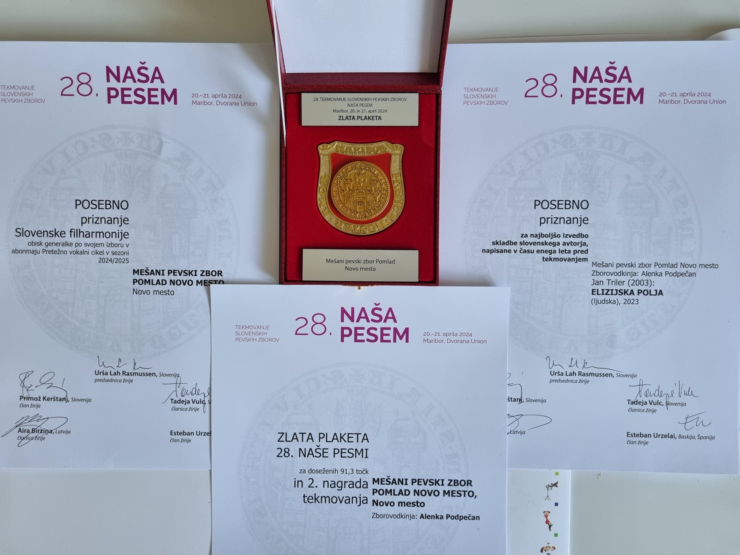 Na najvišjem državnem zborovskem tekmovanju Naša pesem smo nastopili že sedmič (1995, 1997, 1999, 2003, 2005, 2010 in 2024) in tokrat, pod umetniškim vodstvom dirigentke Alenke Podpečan, prvič v zgodovini osvojili zlato plaketo, skupno 2. mesto in dodatne nagrade. Gre za največji uspeh zbora iz te regije na državnem tekmovanju do sedaj (91,3 točke).